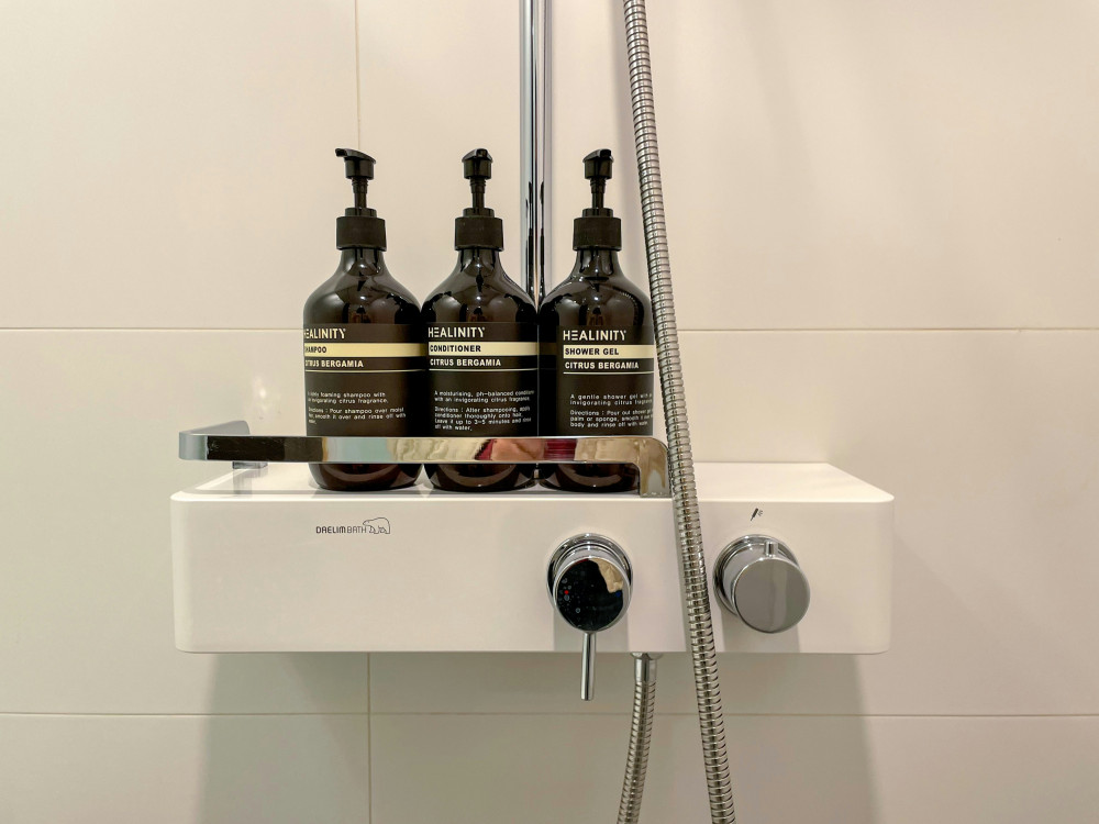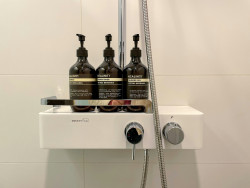 Das Duschsystem kann mit Durchlauferhitzern ab 18 kW/h verwendet werden und hat einen Mindestdurchfluss von 7 Litern pro Minute. Es kann außerdem mit einer optionalen EasyReach-Ablage zur Aufbewahrung von Duschprodukten erweitert werden.